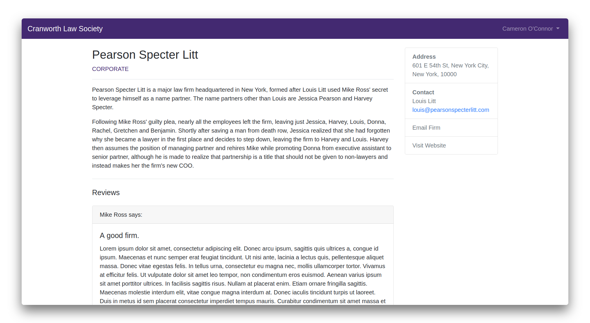 Users can view a list of all firms, and sort this list by category. Clicking on a firm brings up the firm detail page, which includes important information, as well as reviews which previous interns/employees have left of this firm. Static pages are generated automatically. Featured firms for the homepage are randomised dynamically.